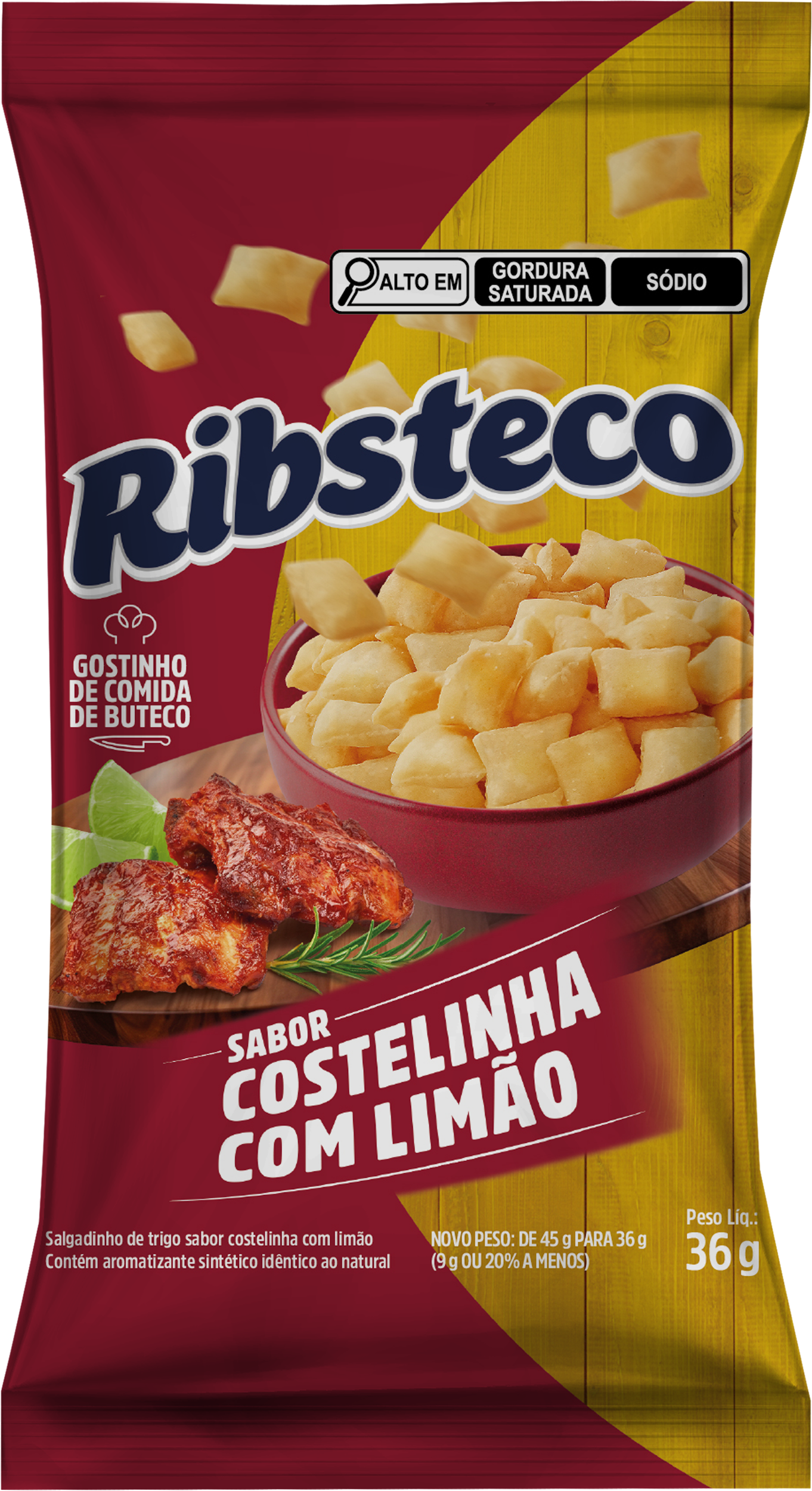 Apresentando o Ribsteco sabor Costelinha com Limão - o snack de trigo que combina a suculência da costelinha com o frescor cítrico do limão!